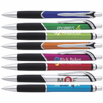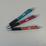 Retractable Ballpoint Pen. Metallic Barrel with textured rubber grip.
